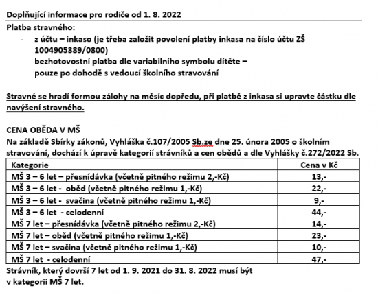 Stravné se hradí formou zálohy na měsíc dopředu.